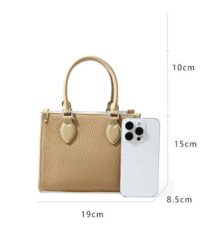 Each bag is handcrafted with textured pebbled genuine leather, offering a luxurious feel with long-lasting durability. Designed with a modern minimalist silhouette, these totes are compact yet surprisingly roomy — perfect for carrying your essentials from day to night.
