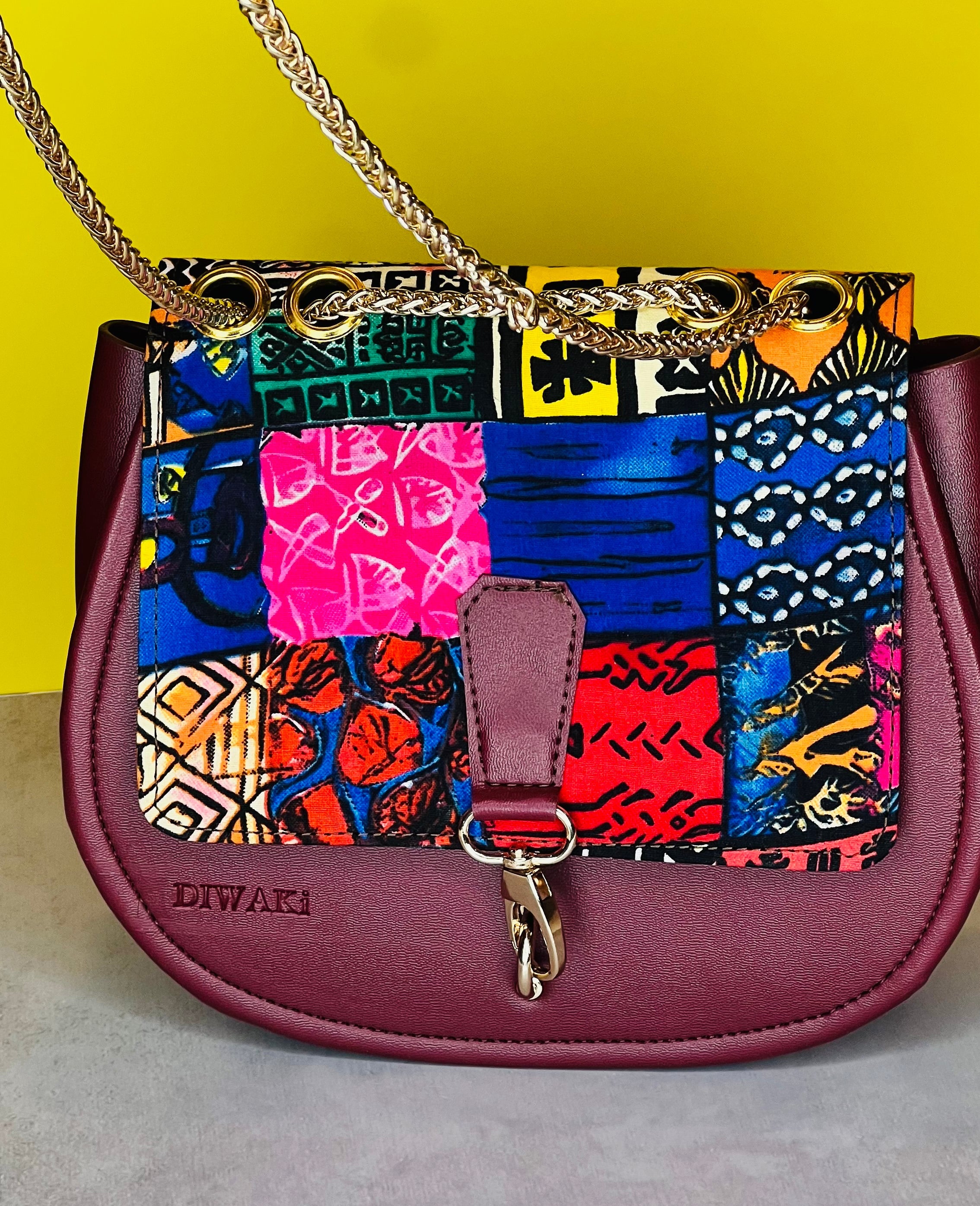 DiwaKi Ankara Patchwork Shoulder Bag – Burgundy Vegan Leather Crossbody with Gold Chain