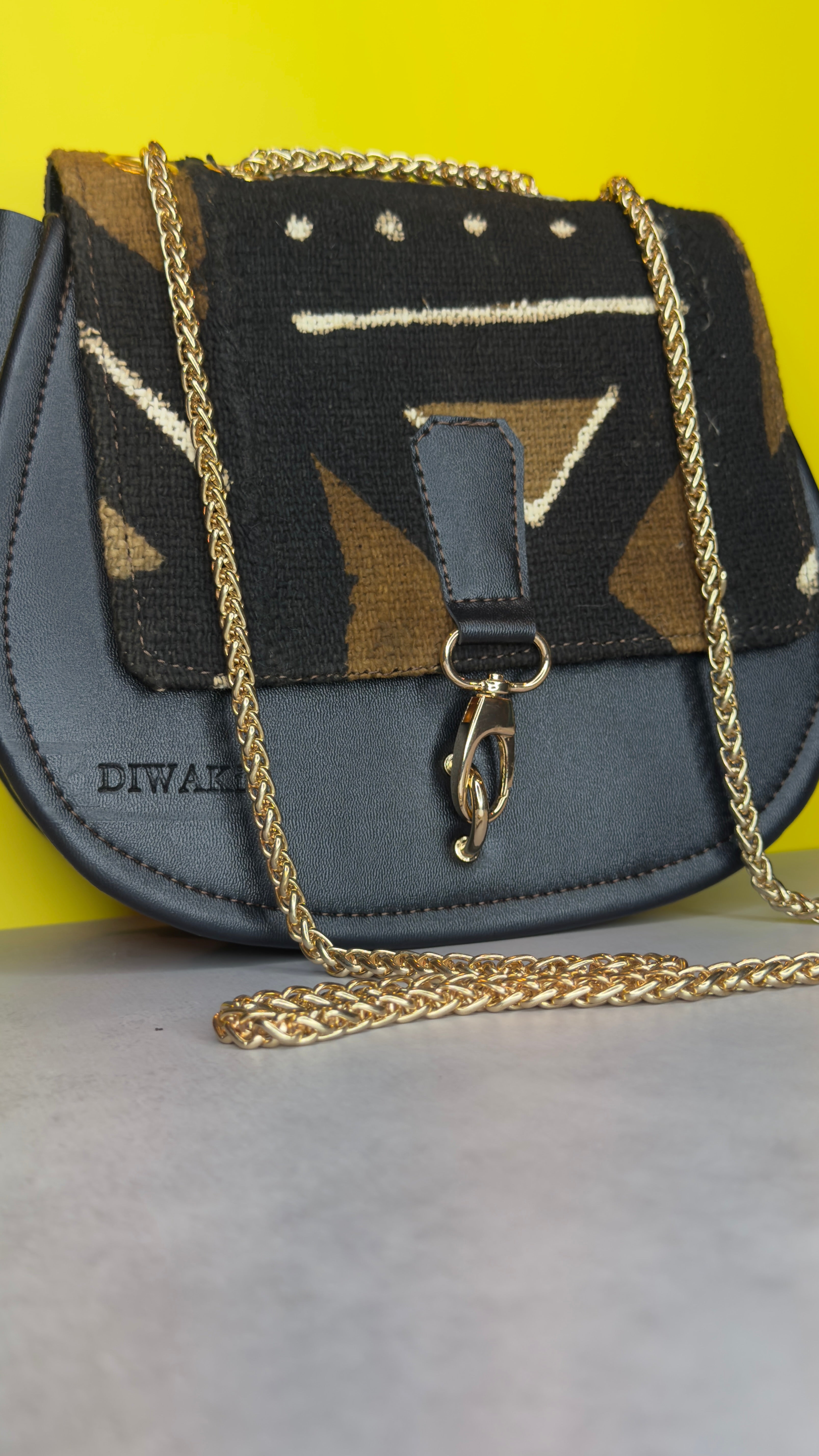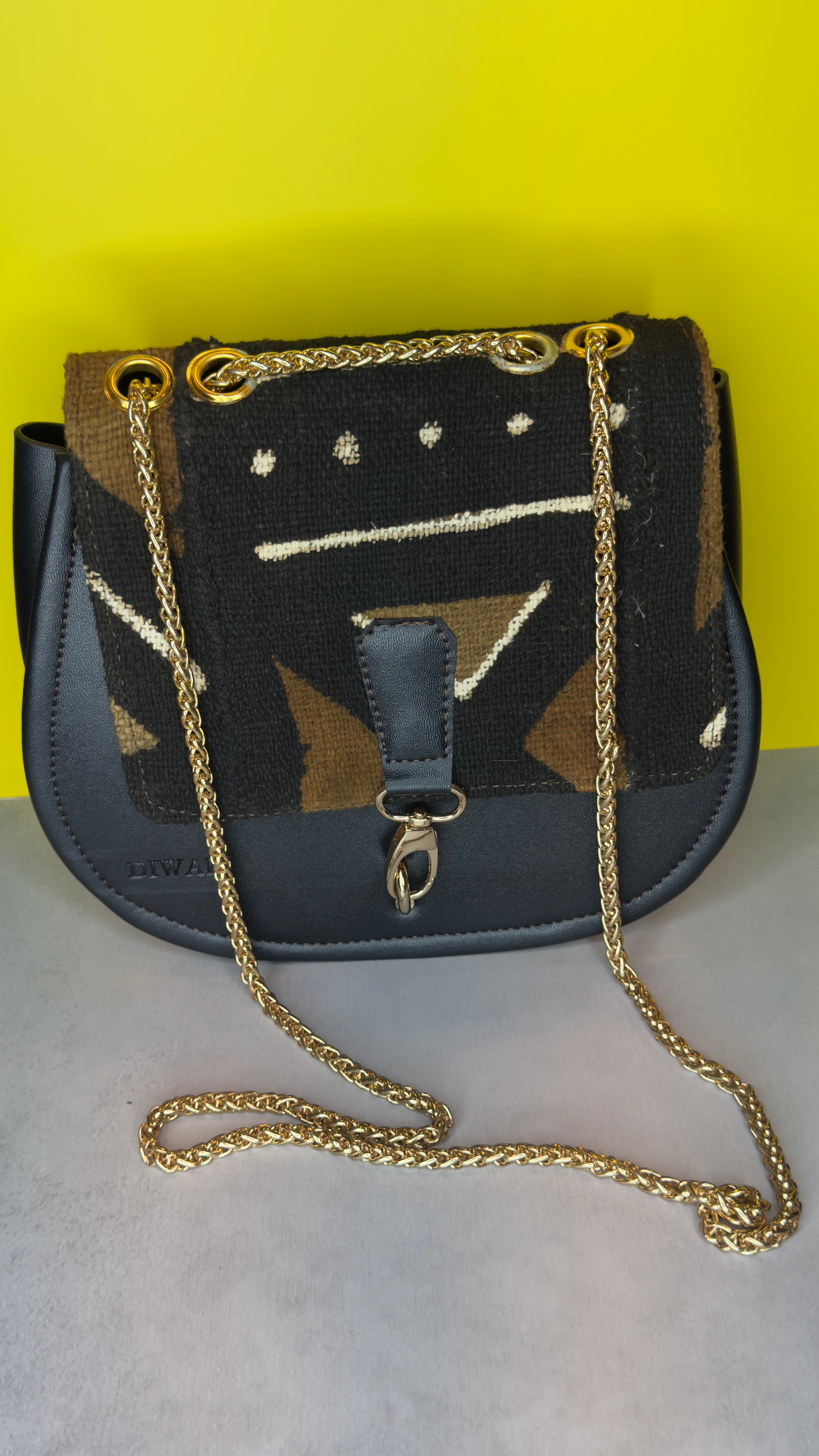 DiwaKi Bogolan Royale Chain Bag – African Mudcloth Leather Shoulder Bag with Gold Chain
