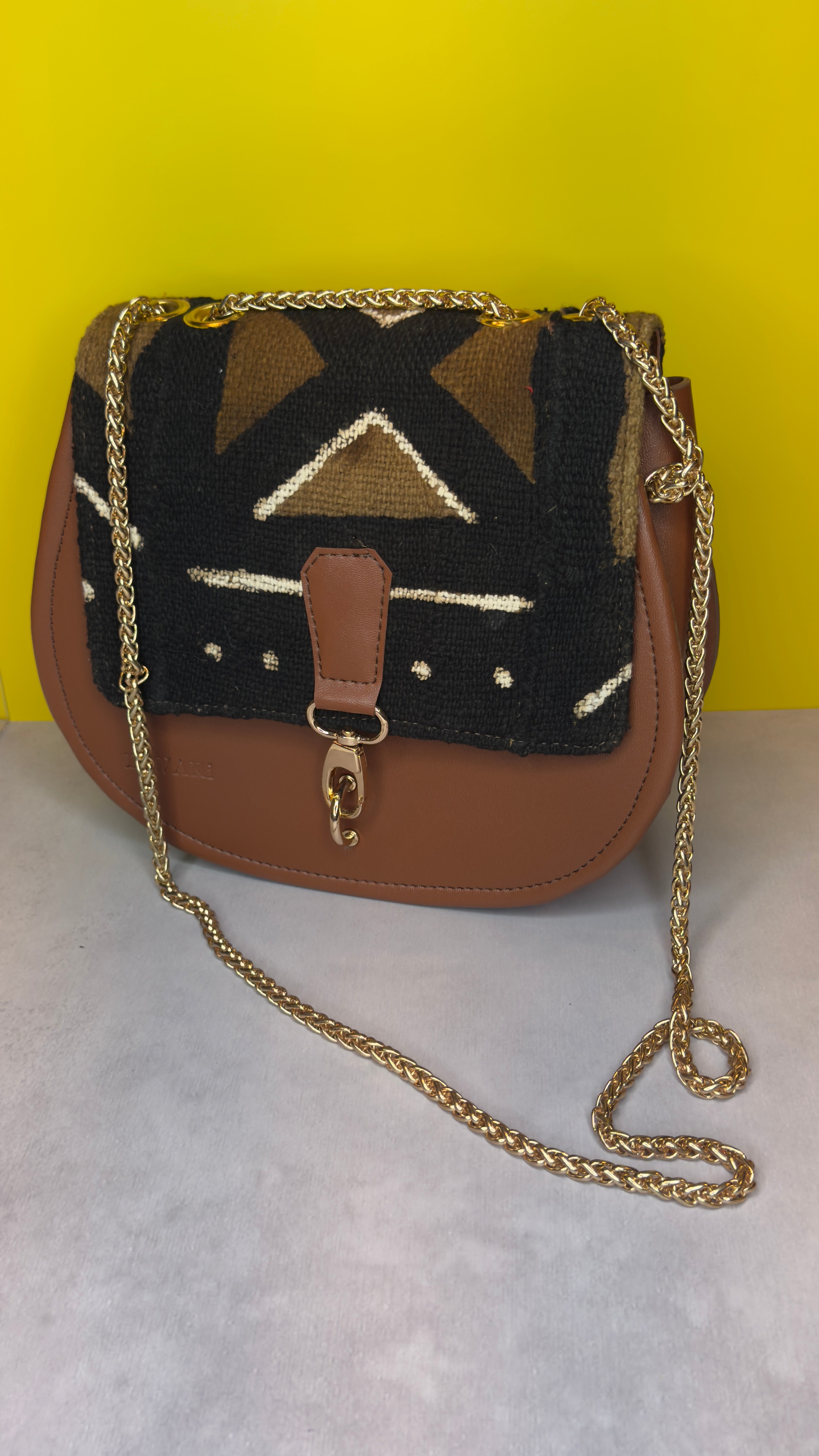 The structured leather base provides durability, while the patterned mudcloth flap evokes traditional hand-woven symbolism — representing protection, courage, and community.